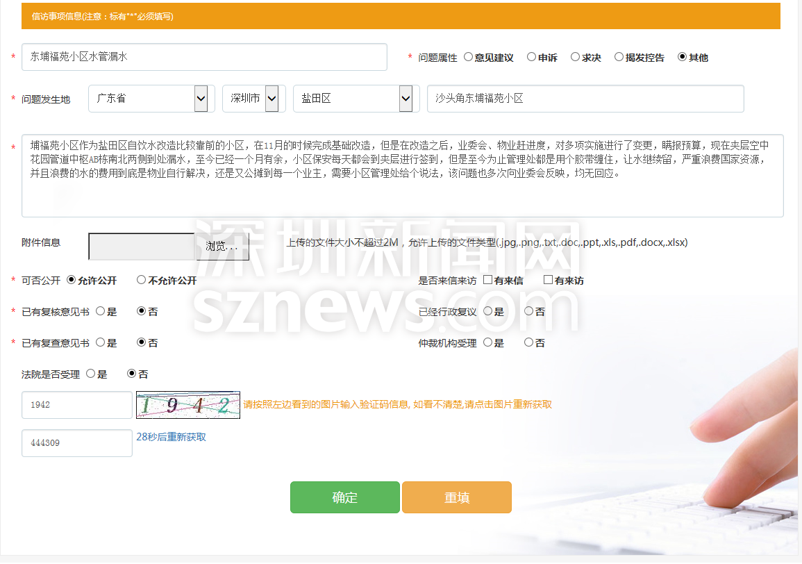 記者通過鹽田政府在線網(wǎng)站的信訪渠道寫信反饋情況,顯示提交成功