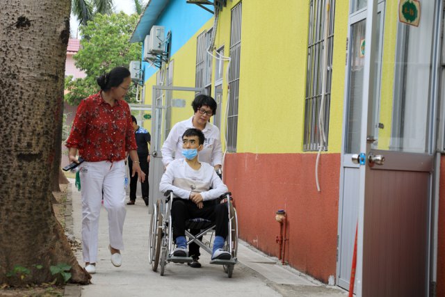 11月24日中午,他坐在輪椅上,讓他的父親向恒金推著他在陽光下散步。"這里的空氣好新鮮。我喜歡這里。"他笑呵呵地對記者說。