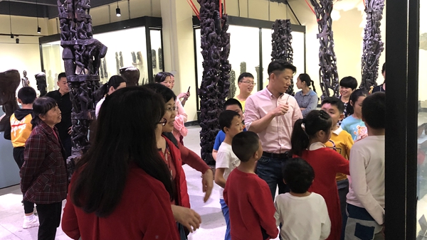 也許是被熱情的笑容和鼓舞所感染,天真活潑的小朋友們一到現(xiàn)場(chǎng)便與非洲大哥哥大姐姐們迅速的打成一片,毫無距離感。在非洲哥哥姐姐們的鼓聲引領(lǐng)下,同學(xué)們首先來到非洲文化博物館,由于大家都是第一次接觸非洲藝術(shù)品,哇哇哇的贊嘆聲此起彼伏,博物館工作人員瞬間被大家緊緊包圍,對(duì)各種藝術(shù)品提出了無數(shù)個(gè)五花八門的問題,真正成了“十萬個(gè)為什么”“案發(fā)現(xiàn)場(chǎng)”?!榜R賽人為什么住牛糞房子啊?”“木頭為什么是黑色的啊”“坐了酋長(zhǎng)椅是不是就可以做酋長(zhǎng)了?”……由于同學(xué)們第一次這么近距離接觸非洲文化,實(shí)在是太好奇太熱情,與各種藝術(shù)品親密接觸拍照、坐酋長(zhǎng)椅體驗(yàn)“做酋長(zhǎng)”的感覺、甚至工作人員也“網(wǎng)開一面”讓大家騎在大象和獅子木雕上盡情玩耍,導(dǎo)致原本計(jì)劃半小時(shí)的參觀時(shí)間足足一個(gè)半小時(shí)才結(jié)束。
