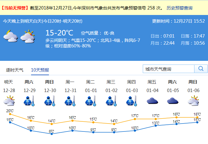 記者從深圳市氣象局了解到,27日晚上到28日白天(今日20時-明天20時)氣溫在15-20℃,空氣質量優(yōu)-良,深圳市以多云間陰為主天;北風3-4級,陣風6-7級;相對濕度60%-80%。
