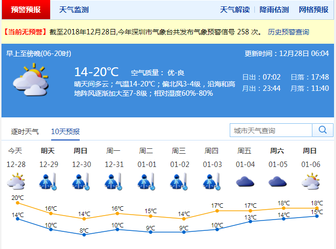 深圳市氣象局預(yù)計(jì),12月28日受冷空氣前鋒影響,我市多云間晴天,風(fēng)力加大,沿海和高地最大陣風(fēng)7-8級,氣溫下降,早晚清涼;29日-元月2日受冷空氣主體影響,氣溫顯著下降,天氣持續(xù)寒冷,最低氣溫在8℃左右,伴有7-9級陣風(fēng),間中有小雨。寒冷天氣將持續(xù)5-6天。