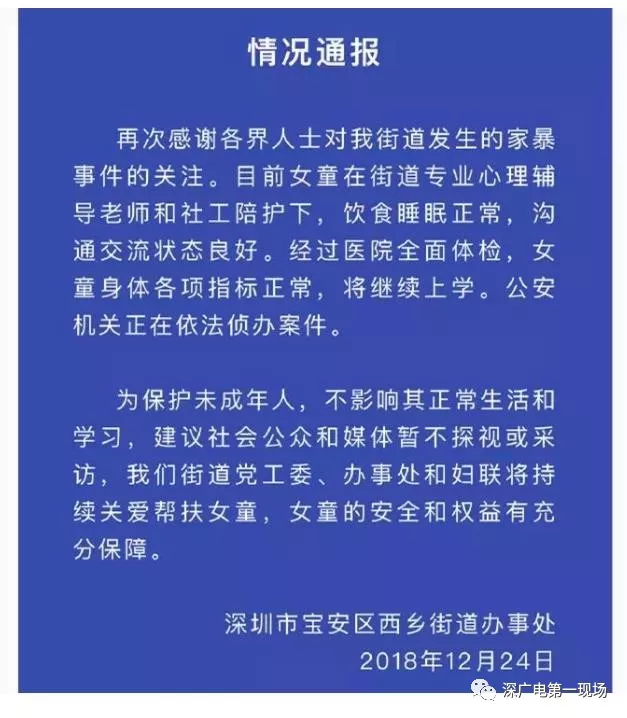 12月24日晚,深圳市寶安區(qū)西鄉(xiāng)街道辦通報表示:目前女童在街道專業(yè)心理輔導(dǎo)老師和社工陪護(hù)下,飲食睡眠正常,溝通交流狀態(tài)良好。經(jīng)過醫(yī)院全面體檢,女童身體各項指標(biāo)正常,將繼續(xù)上學(xué)。