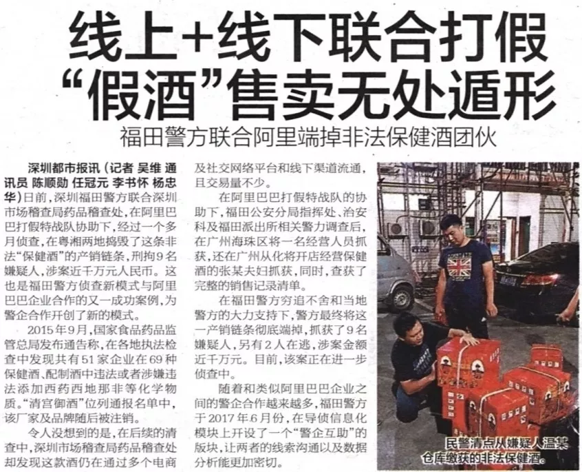 ★★福田警方聯(lián)合深圳市場(chǎng)稽查局藥品稽查處,在阿里巴巴“打假特戰(zhàn)隊(duì)”協(xié)助下,經(jīng)過一個(gè)多月偵查,于粵湘兩地?fù)v毀了非法“保健酒”的產(chǎn)銷鏈條,刑拘9名嫌疑人,涉案價(jià)值近千萬元人民幣。