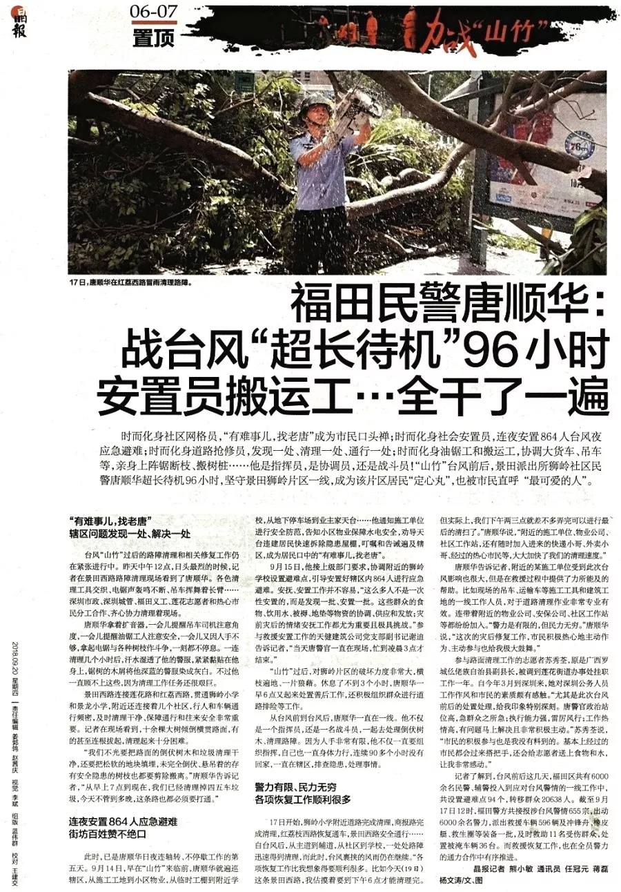 ★★深圳遭遇三十年來最強(qiáng)臺(tái)風(fēng)“山竹”襲擊,景田派出所民警唐順華堅(jiān)守景田獅嶺片區(qū),頂風(fēng)冒雨搶險(xiǎn)救災(zāi),處理倒伏樹木、清理路障,連續(xù)90多個(gè)小時(shí)沒有回家。