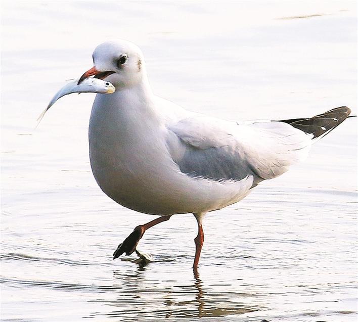 再往東去,便是深圳河入???這里也是深圳河與新洲河的交匯處。在這里,除了5只黑臉琵鷺正在河口覓食,河面上還聚集著上千只紅嘴鷗。每當(dāng)疏浚河道的船只駛過,紅嘴鷗就成群結(jié)隊地尾隨著船只的航跡,捕食被船槳翻到水面上的魚蝦。