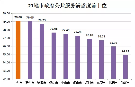 在調(diào)查的122個縣(市、區(qū))中,越秀區(qū)政府公共服務(wù)總體滿意度最高(83.95分),連續(xù)五年在縣(市、區(qū))評價中居首;隨后依次為:天河區(qū)、惠城區(qū)、端州區(qū)、光明區(qū)、南山區(qū)、斗門區(qū)、從化區(qū)、南沙區(qū)、順德區(qū),居前十位的均處于珠三角地區(qū),是我省公共服務(wù)建設(shè)標桿地區(qū)。