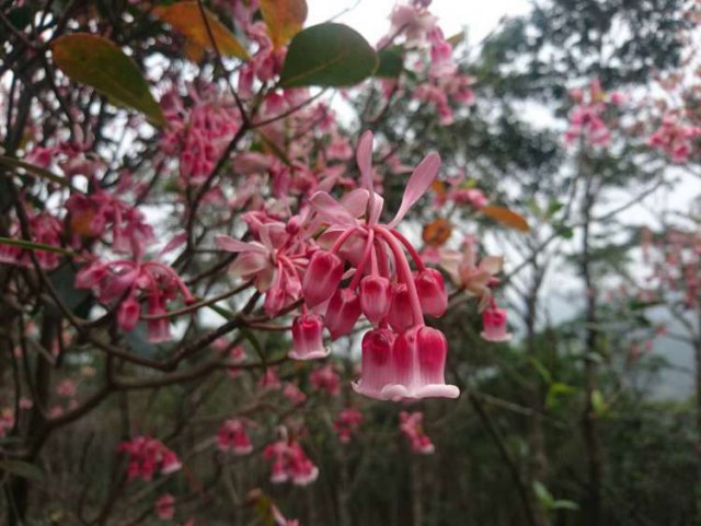 吊鐘花朵朵成束,好似鈴鐺吊掛,花粉紅白色,妖嫩媚人,晶瑩醒目,花期正值元旦、春節(jié),長(zhǎng)期以來(lái)作為吉祥的象征,為嶺南鄉(xiāng)土名花。資料顯示,早在清代中葉,廣東一帶已有將吊鐘作為年花的習(xí)俗。清代屈大均的《廣東新語(yǔ)》記載:"吊鐘花并未折下,能耐久,臘冬多賣(mài)于街,土人市以度歲,取其置中不萎也。"吊鐘花紅的稱(chēng)為"金鐘",白的叫做"銀鐘",朵朵彎垂,似無(wú)數(shù)的小鈴鐺在空中搖曳。古詩(shī)中所詠的"天香新綠一叢叢,金鐘深藏一片紅。風(fēng)吹銀鈴香陣陣,勝過(guò)百花鬧新春"就是對(duì)吊鐘花的生動(dòng)寫(xiě)照。