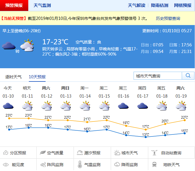 綜合海氣環(huán)流分析和歷史氣候背景,市氣象局預(yù)計(jì)深圳的1月將是“氣溫起伏大、階段性陰冷、降雨少而弱”的特點(diǎn)。分別在15-17日、24-25日、1月底至2月初會(huì)有冷空氣影響,伴小雨或分散小雨,沿海和高地陣風(fēng)7-8級,且月內(nèi)最低氣溫10℃以下會(huì)有三天左右。而在冷空氣間歇期,則受暖濕南風(fēng)影響,空氣濕度加大,易出現(xiàn)霧和輕微回南天。未來幾日多云間陰天,陽光增多,早晚有輕霧,天氣溫暖,早晚較濕潤;15日起冷空氣影響,氣溫小幅下降。