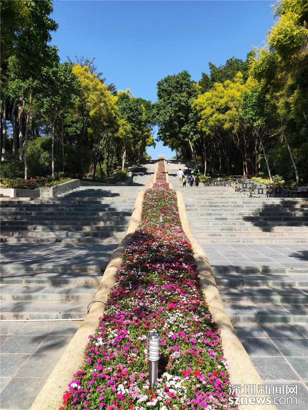此次提升主要通過打造迎賓廣場花海,提升百步云梯、映翠湖、歡樂劇場周邊和南門廣場停車場等區(qū)域的綠化景觀效果。以“流花織錦”為主題,采用富有動感的流水和水波紋形態(tài),以活潑靈動的花帶、花毯等形式打造簡潔大氣、色彩斑斕的景觀;入口的游客中心建筑外墻改造為立體花墻,采用兩種深淺不一的紅色系矮牽牛等時花,以動感的波浪形式布置,踏步徐行,猶如悅動的旋律;原有的地下車庫屋頂區(qū)域則改造成趣味盎然的小游園,通過花境、鋪裝、藝術花壇統(tǒng)一設計布局,與流花織錦的主題緊密相應;百步云梯的中央花帶點綴于一片濃綠間,拾階而上,景色隨著高度變化,美景盡收眼底。