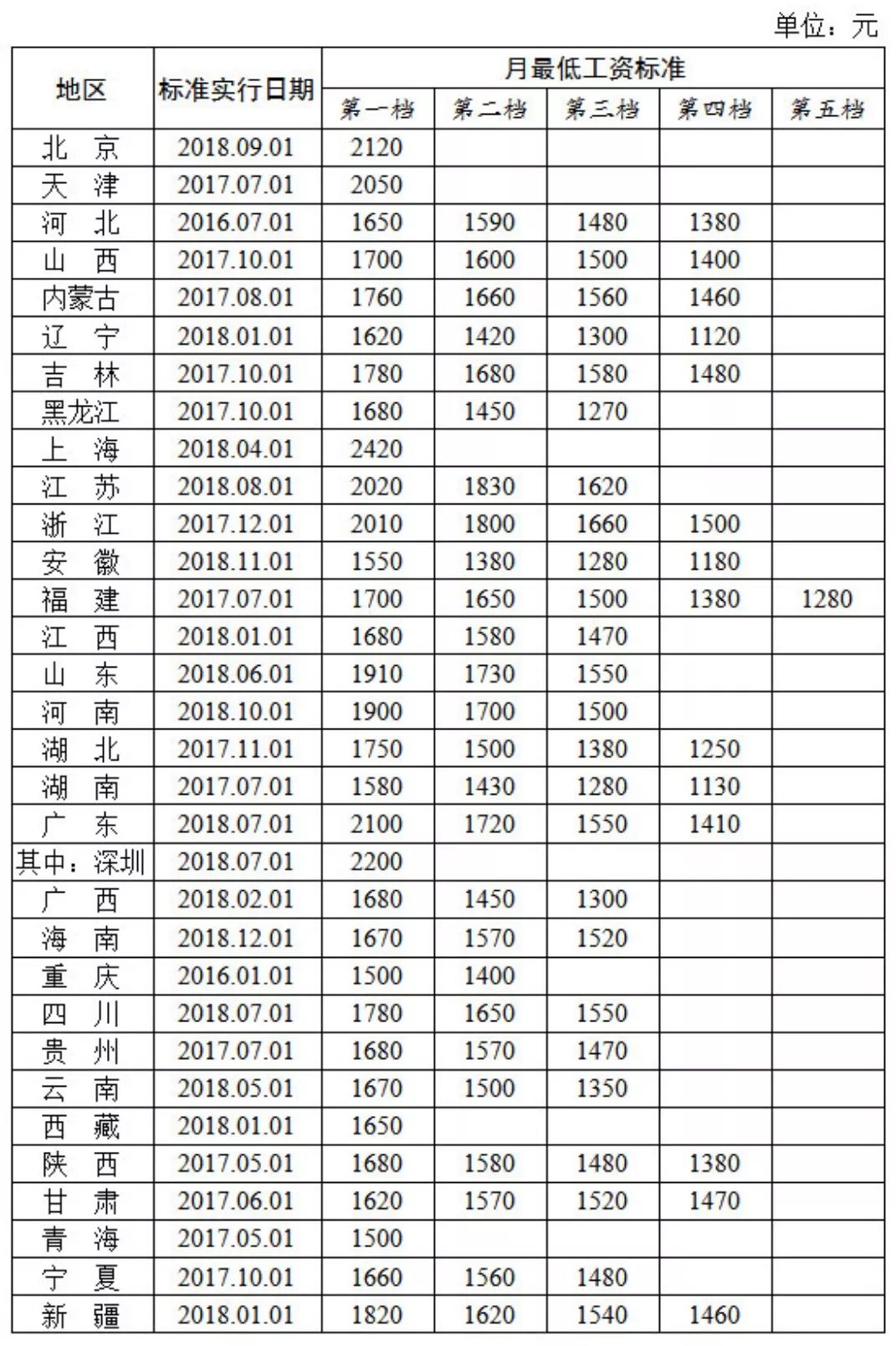 ①人社部10日公布全國各地區(qū)月最低工資標準情況(截至2018年12月),其中,上海月最低工資標準達到2420元,為全國最高。上海、廣東、北京、天津、江蘇、浙江這6個省份月最低工資標準超過2000元。(深圳最低工資標準已于2018年8月1日起調整,全日制就業(yè)勞動者最低工資標準為2200元/月,非全日制就業(yè)勞動者小時最低工資標準為20.3元/小時。)