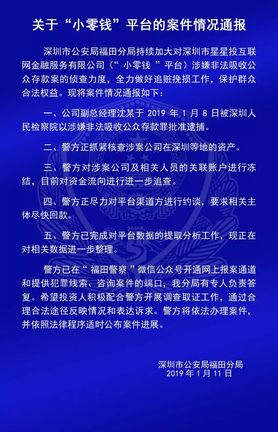 福田公安通報(bào)六家平臺(tái)涉嫌非法吸收公眾存款案的情況