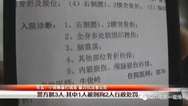 記者從中海醫(yī)院了解到,被打城管隊(duì)員徐濤右側(cè)腰兩橫突骨折。龍崗警方發(fā)通報(bào),鑒定徐濤為輕傷,以涉嫌故意傷害罪,對(duì)光頭男子趙某青采取刑事強(qiáng)制措施,同時(shí)對(duì)其妻李某玉和女老鄉(xiāng)王某,以毆打他人處以行政處罰。