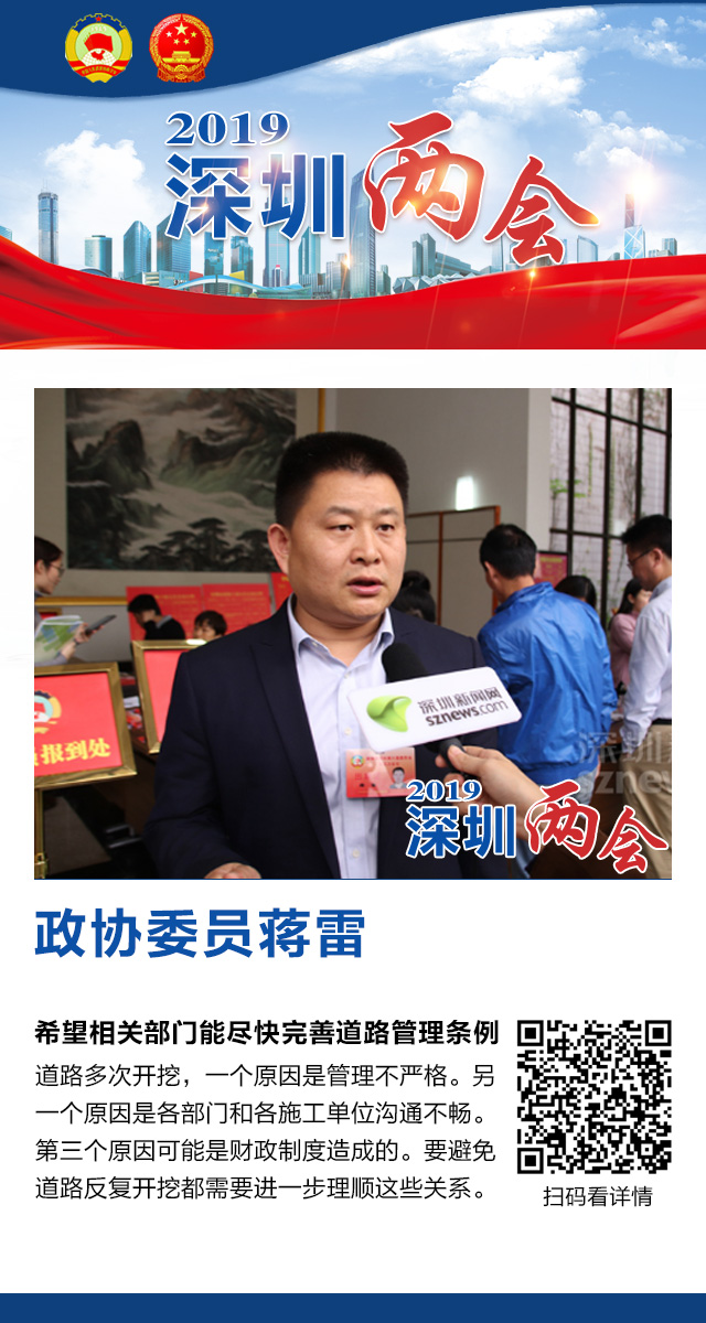 深圳新聞網(wǎng)2019年1月17日訊 深圳市政協(xié)六屆五次會議1月16日開幕,記者就全市范圍內(nèi)出現(xiàn)的道路反復(fù)開挖向政協(xié)委員們征求解決良方,委員們表示,在(道路反復(fù)開挖)這件事情上,我們每個(gè)人都是受害者。只有各部門一盤棋,讓規(guī)劃更有前瞻性,讓城市建設(shè)慢下來,才能解決問題,減少給市民生活帶來的各種不便。下面讓我們一起來看看委員們的觀點(diǎn)。