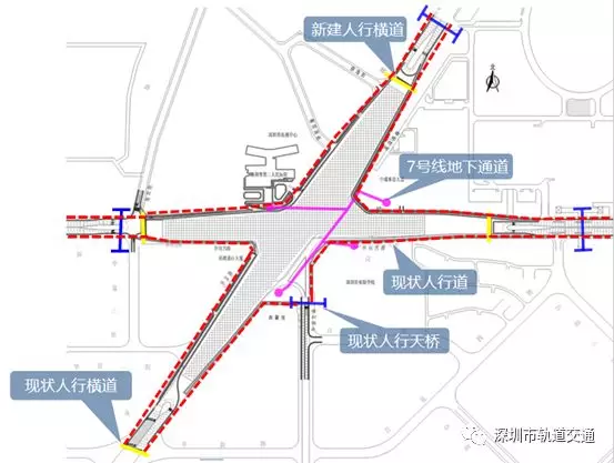 行人可利用平交路口、既有人行天橋、地下通道、7號線4個(gè)出入口過街。