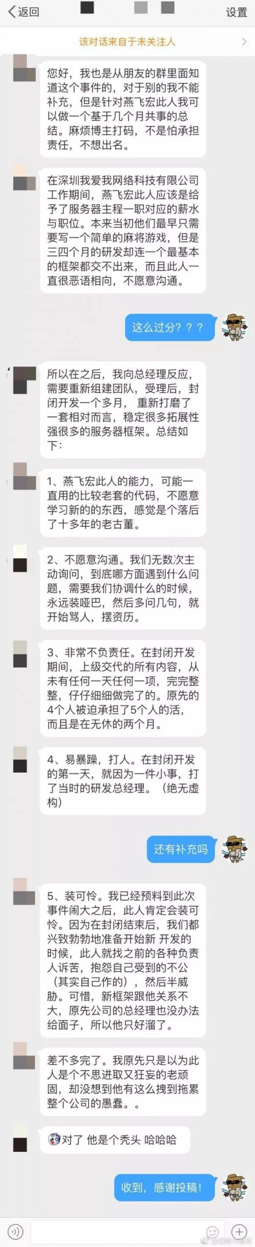 隨后,一位自稱是燕飛宏前同事的網(wǎng)友發(fā)文稱:之前的公司讓他做很簡單的游戲,但是他三四個月連框架都沒寫出來,業(yè)務(wù)能力只會用老套代碼,不愿意跟同事溝通,工作很不負責任、易暴躁、打人。