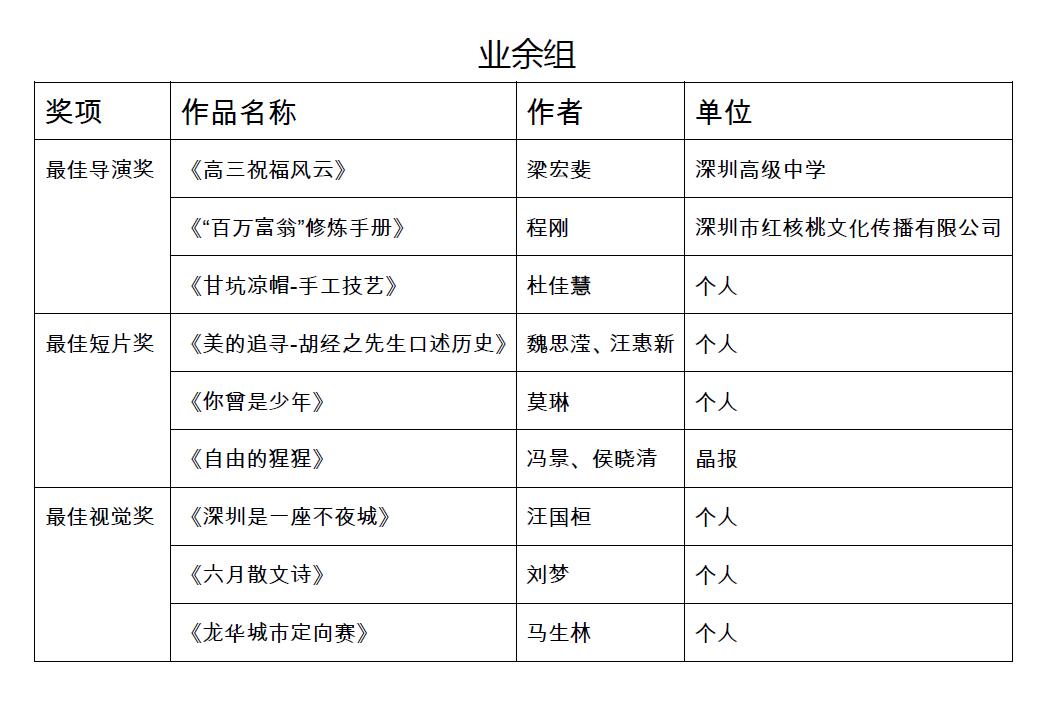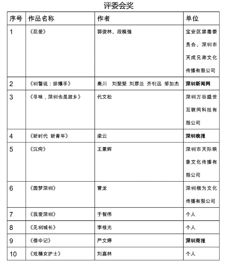 作為創(chuàng)意12月活動的重頭項目,本次視頻大賽由深圳報業(yè)集團、深圳市網(wǎng)絡(luò)媒體協(xié)會主辦,深圳新聞網(wǎng)、深圳市中影南方廣告有限公司、深圳市上御同禧文化傳播有限公司承辦,面向社會共征集到視頻作品500余部。大賽組委會邀請了專業(yè)媒體人士和影視大咖擔任評委,共有70件作品入圍終評會,經(jīng)過組委會辦公室的最終評選,最終確定了獲獎作品。參加比賽的,既有新聞媒體界和廣告公司的專業(yè)人士,也有各行各業(yè)熱愛視頻拍攝制作的“發(fā)燒友”,參賽作品題材廣泛,既有記錄深圳城市風(fēng)貌的視覺大片,也不乏故事性強、拍攝剪輯手法新穎、主題立意深刻的作品。