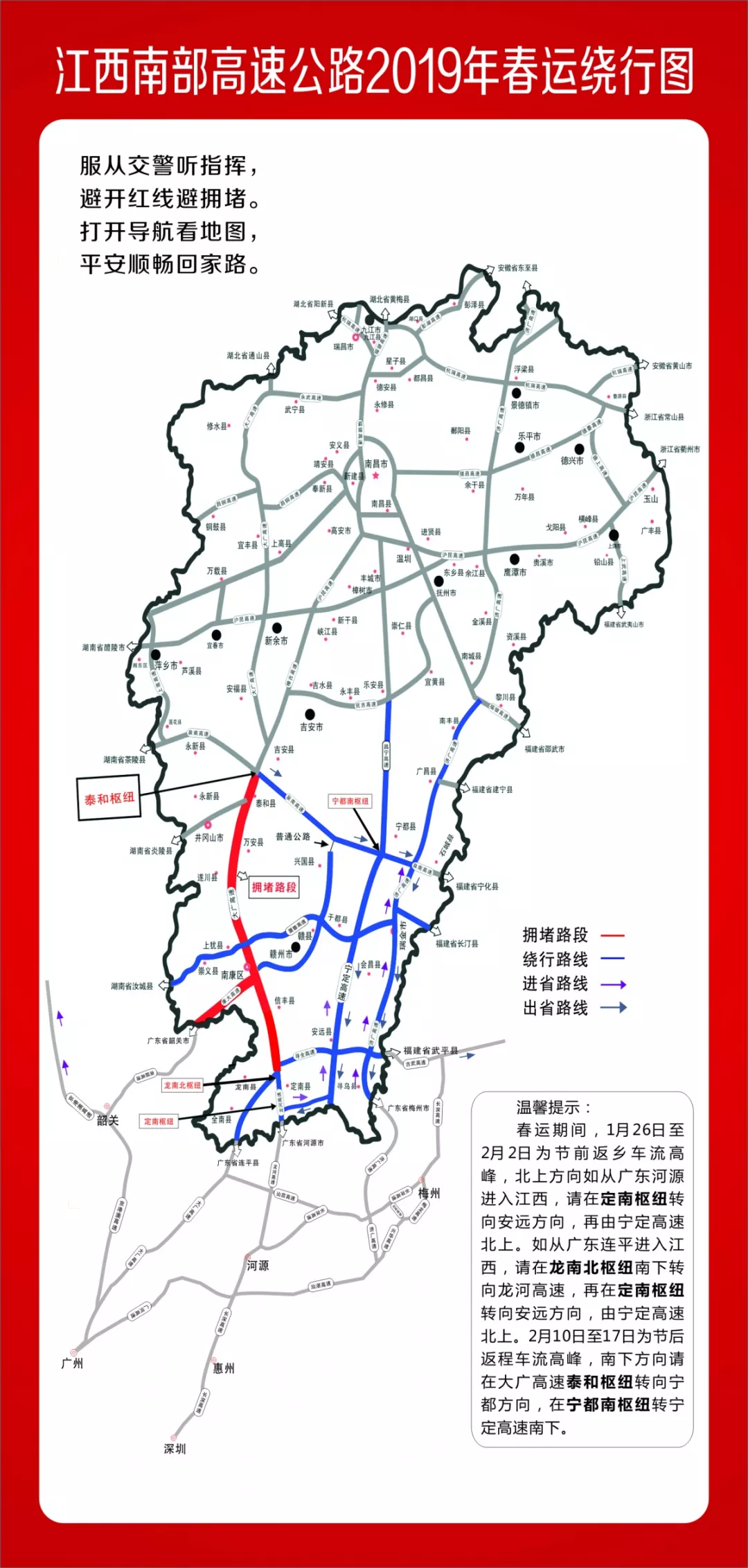 由長深高速北上,在廣東河源市境內(nèi)轉龍河高速進入江西,后由定南樞紐轉寧定高速聯(lián)絡線(S86),38公里后再由寧定高速北上,以避開大廣高速擁堵路段。