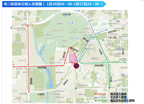 市二醫(yī)院車(chē)行進(jìn)入示意圖--紅色線(xiàn)條為西邊進(jìn)入醫(yī)院道路,藍(lán)色線(xiàn)條為北邊進(jìn)入醫(yī)院道路,綠色線(xiàn)條為南邊及東邊進(jìn)入路線(xiàn)。