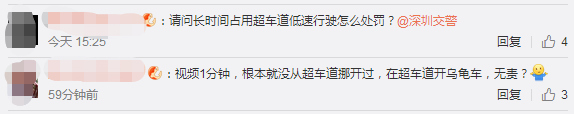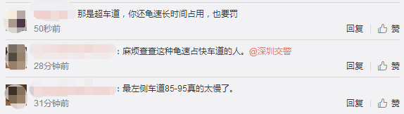 1月28日下午5點(diǎn),深圳交警在微博上也給網(wǎng)友作出回復(fù),對(duì)于長(zhǎng)時(shí)間龜速占用超車道的行為也將一并調(diào)查。