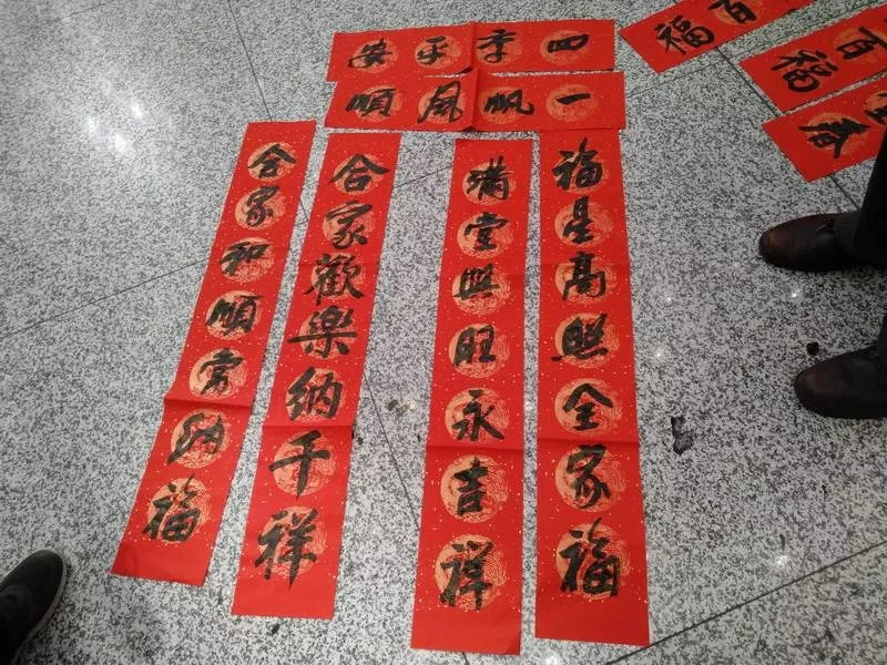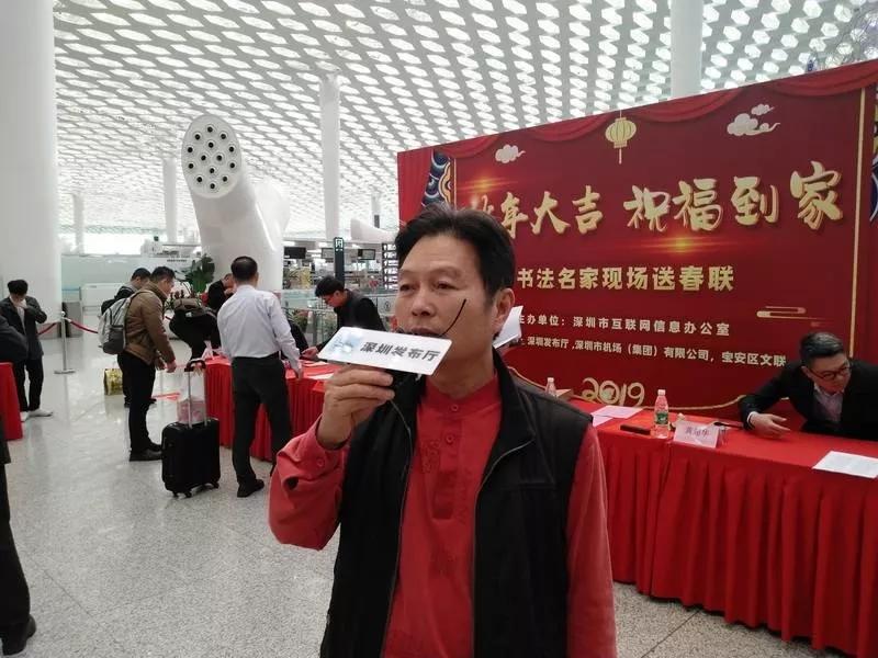 寶安區(qū)書法家協(xié)會主席李高揚介紹,在機(jī)場送春聯(lián)很有意義,可以給全國各地的朋友們送上新年祝福。這次深圳發(fā)布廳攜手深圳機(jī)場舉辦活動,寶安區(qū)書法家協(xié)會集結(jié)高手出動為群眾服務(wù),為市民送去祝福。他祝大家新春快樂,闔家幸福。