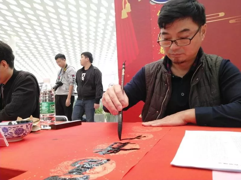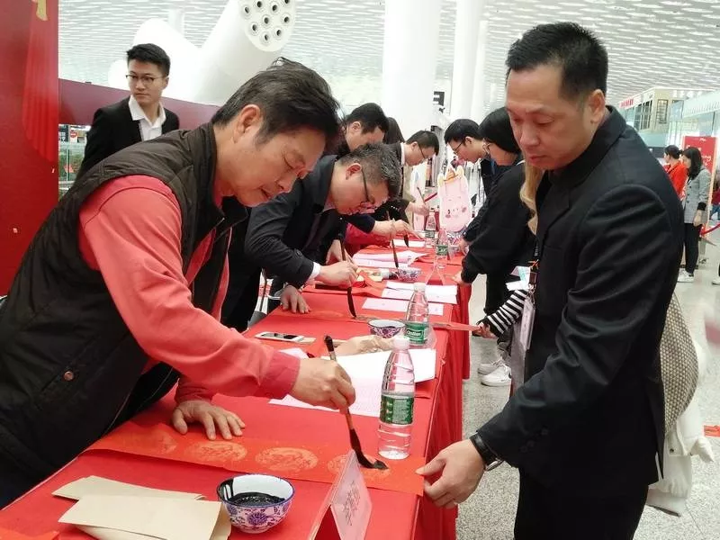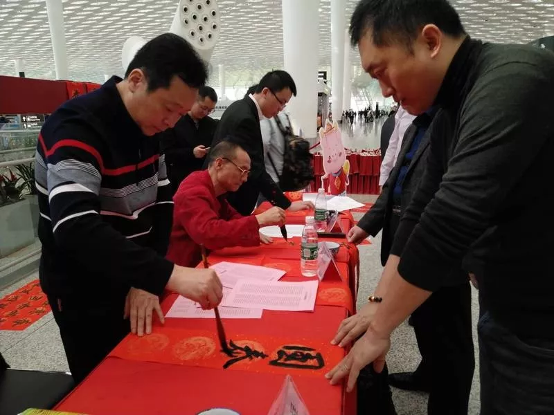 ▲旅客們請(qǐng)書法家們寫春聯(lián),把“福”帶回家!