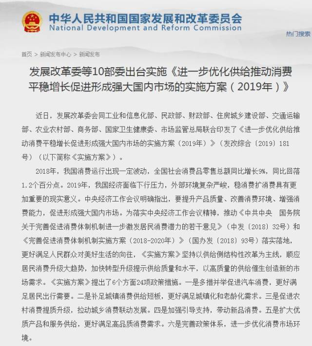 1月29日,“看不過去”的發(fā)改委就印發(fā)了《進一步優(yōu)化供給推動消費平穩(wěn)增長促進形成強大國內市場的實施方案(2019年)》