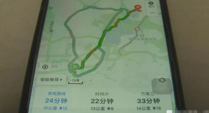 導航路線顯示,乘客所堅持的走法是常規(guī)路線,司機的走法距離更長,但用時較短。