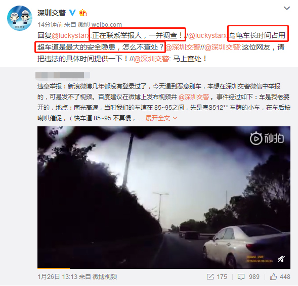 1月28日,深圳交警在微博回復該網(wǎng)友稱馬上查處,并希望爆料博主能提供具體的時間