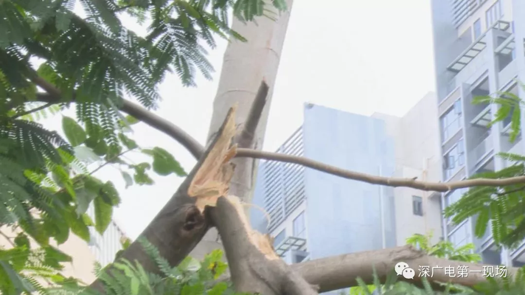 園林養(yǎng)護(hù)公司相關(guān)負(fù)責(zé)人介紹,這棵樹的樹名叫做南洋楹,記者觀察發(fā)現(xiàn),該路段種植的樹木基本都屬于這一樹種,但唯獨(dú)這一棵出現(xiàn)了樹枝折斷的情況。記者還在旁邊發(fā)現(xiàn)了一棵同樣的樹,樹干已經(jīng)被折斷,劉先生說,這還是去年9月份,被臺風(fēng)山竹吹斷的。像今天這種風(fēng)平浪靜的情況下斷枝,非常少見。
