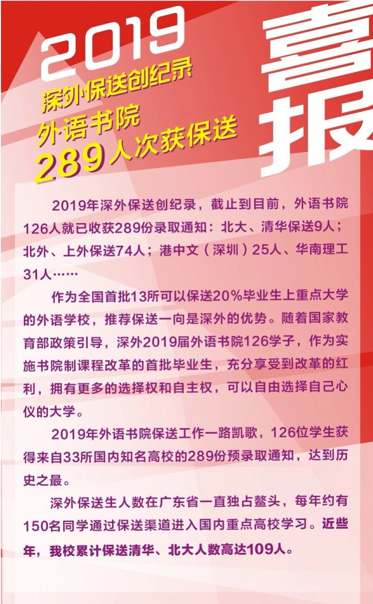 深圳晚報2019年02月17日訊 2月16日,記者從深圳外國語學校獲悉,該校2019年保送創(chuàng)紀錄。截至目前,該校外語書院126人收獲289份預錄取通知,其中北京大學、清華大學保送9人;北京外國語大學、上海外國語大學保送74人;香港中文大學(深圳)25人、華南理工大學31人……