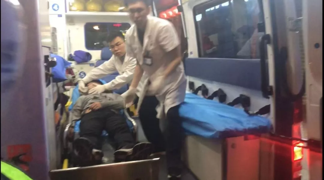 救護(hù)車趕到現(xiàn)場,隊(duì)員們爭分奪秒將男子抬上救護(hù)車。