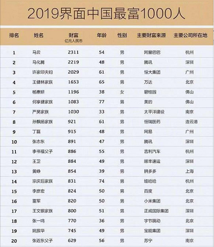界面發(fā)布2019中國(guó)最富1000人榜:馬云問鼎中國(guó)首富馬化騰緊隨其后