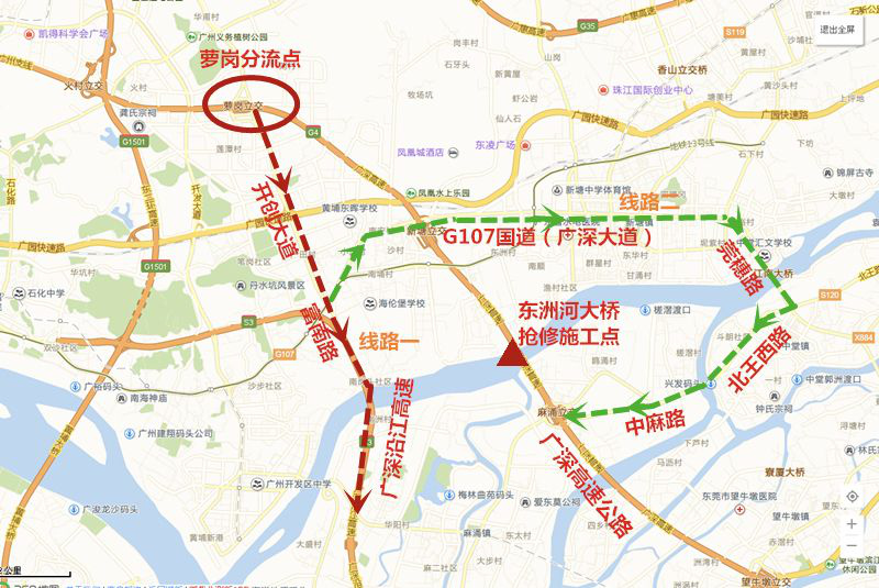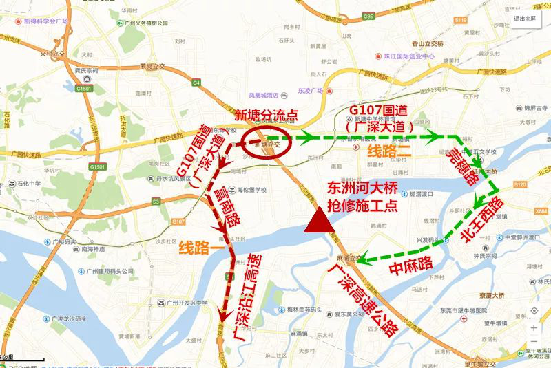 (2)廣深高速公路深圳方向蘿崗出口→開創(chuàng)大道→ G107國(guó)道(廣深大道)→莞穗路→北王西路→中麻路→廣深高速公路麻涌站入口→東莞、深圳。