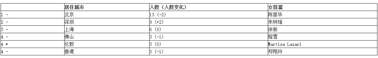 值得注意的是,上榜的女富豪居住城市中,前五名城市均來(lái)自中國(guó),北京以13位上榜女富豪數(shù)位列第一。深圳、上海緊隨其后,各有9位、6位上榜女富豪居住,分別位列第二、第三。