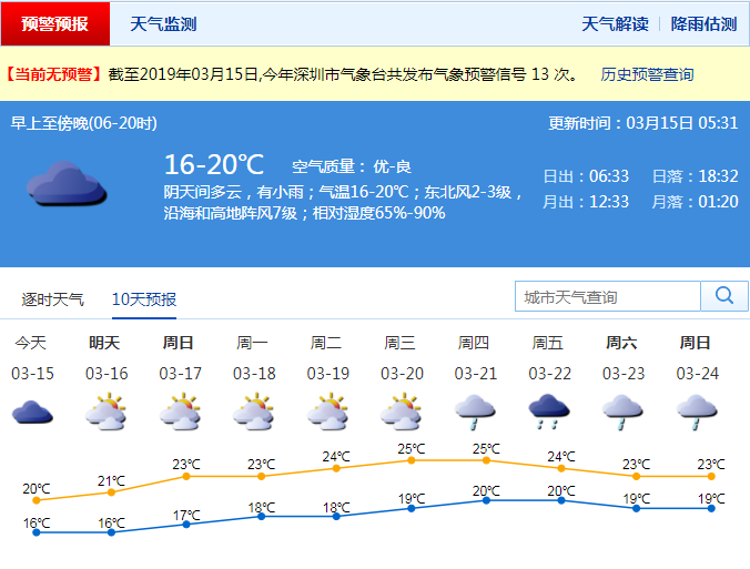 此外,深圳市氣象臺預(yù)計(jì),16-20日多云為主,可見陽光,偶有短時(shí)陣雨,其中19-20日早晚有輕霧或霧;21日起,天氣再趨不穩(wěn)定,降雨增多。