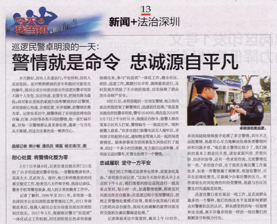 巡邏民警日夜在基層一線工作,是直面群眾最多的一個(gè)警種,他們的執(zhí)法水平直接影響著群眾對(duì)警察隊(duì)伍的認(rèn)識(shí)。群眾感受到的每一份溫情和安全感,離不開(kāi)像卓明浪一樣的一線民警們的默默堅(jiān)守和傾力付出。