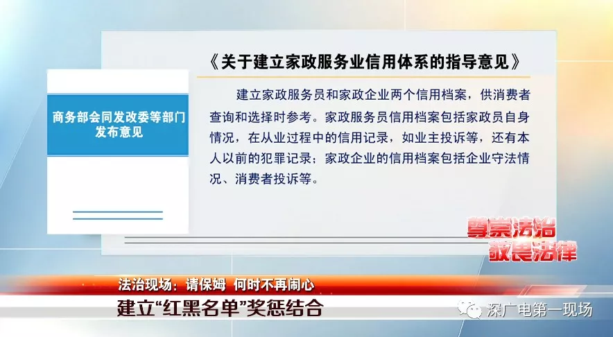趙坤:在深圳,請保姆,育嬰師,鐘點工等等是很多家庭的剛需,但是很多人也抱怨說,要請個好的保姆阿姨實在是太難了,有些雇主因為各種原因家里來來去去換了好幾個阿姨,有些甚至還跟家政公司調(diào)解不成鬧上了法庭。防患于未然,商務(wù)部等部委這次發(fā)布的意見,建立信用檔案,可謂來的正當時。我們也期待深圳能盡快出臺家政行業(yè)信用平臺,期待深圳的家政行業(yè)能更加透明,更加規(guī)范。