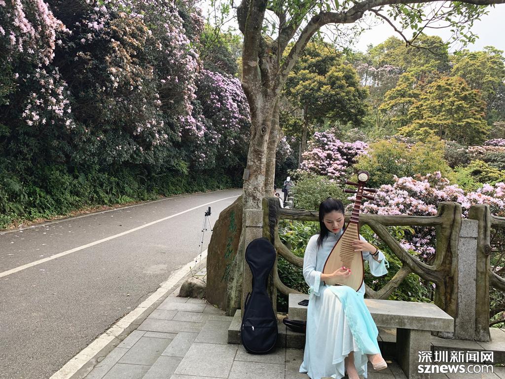 毛棉杜鵑從中,美女身穿古裝手彈琵琶,美如畫。