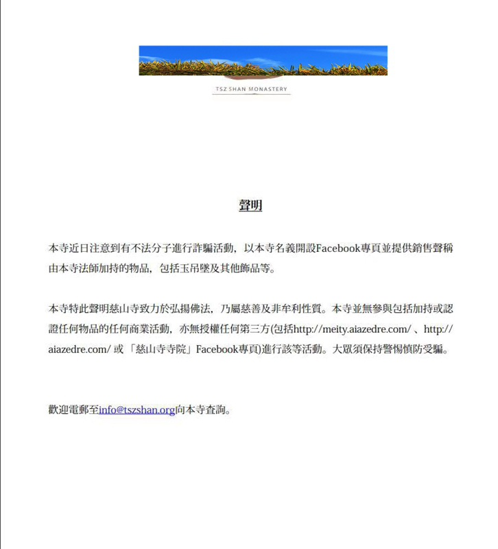 警方同時向深晚提供的證據(jù)中,還有一份香港某知名寺院的聲明。聲明中說:"本寺近日注意到有不法分子進行詐騙活動,以本寺名義開設(shè) Facebook專頁并提供銷售聲稱由本寺法師加持的物品,包括玉吊墜及其他物品等。本寺特此聲明,本寺并無參與加持或認證任何物品的任何商業(yè)活動,亦無授權(quán)任何第三方進行該等活動。大眾須保持警惕慎防受騙。"