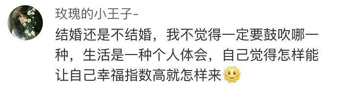一定要遇到理想的結(jié)婚對象才會選擇結(jié)婚。事業(yè)排第一,婚姻排在最后。我進(jìn)入婚姻的初衷是為了讓生活變得更好,而且婚姻更多還是一種合作關(guān)系,兩個(gè)人在一起能夠提高生活品質(zhì),經(jīng)濟(jì)方面相互幫助,降低生活成本,增強(qiáng)風(fēng)險(xiǎn)抵抗能力。身邊朋友未婚的比較多,但有時(shí)看到已婚的朋友生活幸福,會有短暫的焦慮感,但更多地受到父母不幸的婚姻生活的影響,我對婚姻基本沒有什么正面的期望。