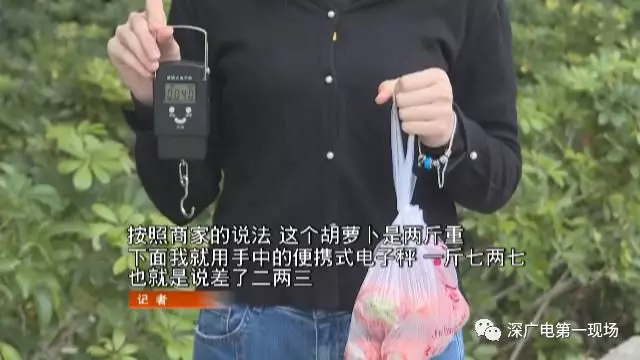 記者按照市民提供的線索,在通道上隨機(jī)選了一個(gè)攤位,購(gòu)買(mǎi)了2斤胡蘿卜,可用自帶的便攜秤稱(chēng)重后,發(fā)現(xiàn)缺了二兩。而在另外一個(gè)攤位上,記者買(mǎi)到的茄子也少了近3兩。