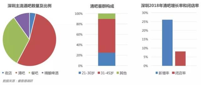 報(bào)告著重以夜店、清吧、餐吧、精釀啤酒吧為主要研究對象。其中,清吧的數(shù)量在主流酒吧業(yè)態(tài)中占比過半——2018年,清吧在深圳超過600家,占據(jù)市場的54%,開業(yè)量超過130家,閉店數(shù)則超過40家,精細(xì)運(yùn)營成為追求現(xiàn)象級爆紅的“網(wǎng)紅”酒吧發(fā)展的主要瓶頸。