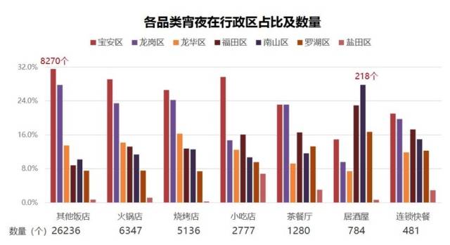 各品類(lèi)宵夜在7個(gè)行政區(qū)占比及數(shù)量