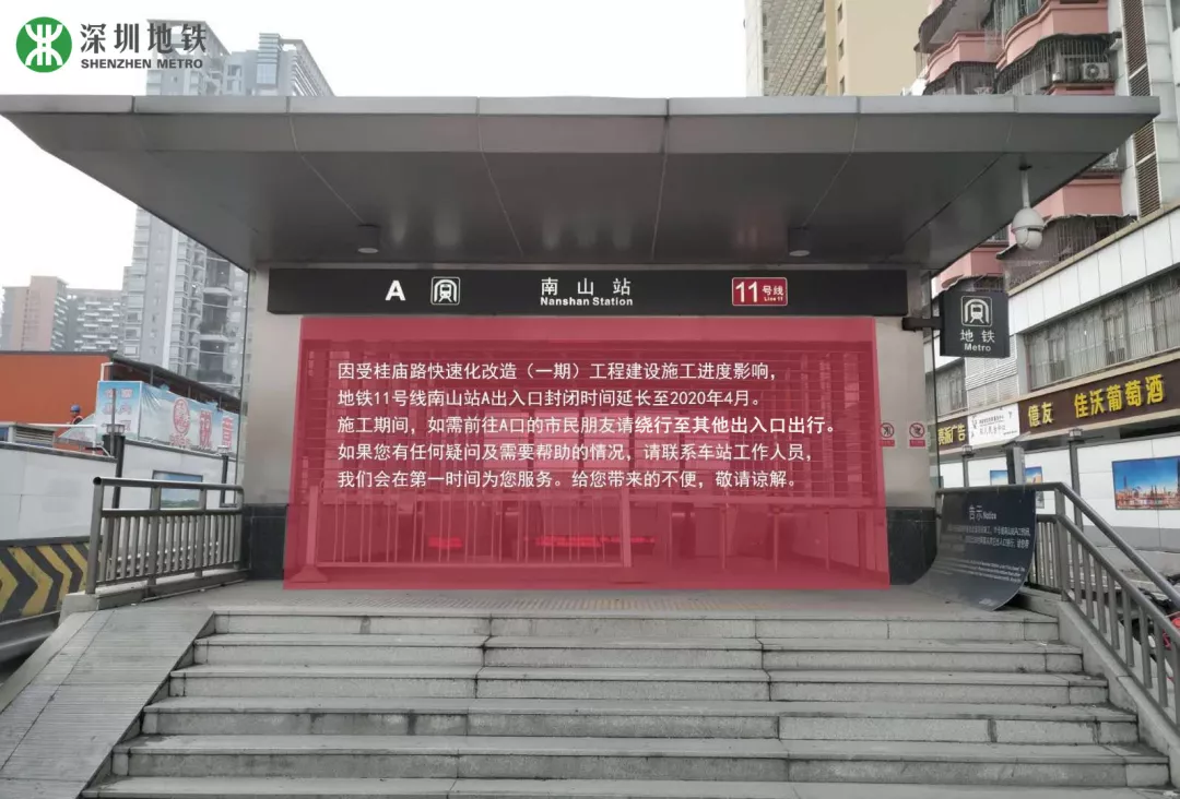 因受桂廟路快速化改造(一期)工程建設(shè)施工進度影響,11號線南山站A出入口封閉時間將延長至2020年4月。施工期間,如需前往A口的市民朋友請繞行至其他出入口出行,如果您有任何疑問及需要幫助的情況,請聯(lián)系車站工作人員,我們會在第一時間為您服務。給您帶來的不便,敬請諒解。