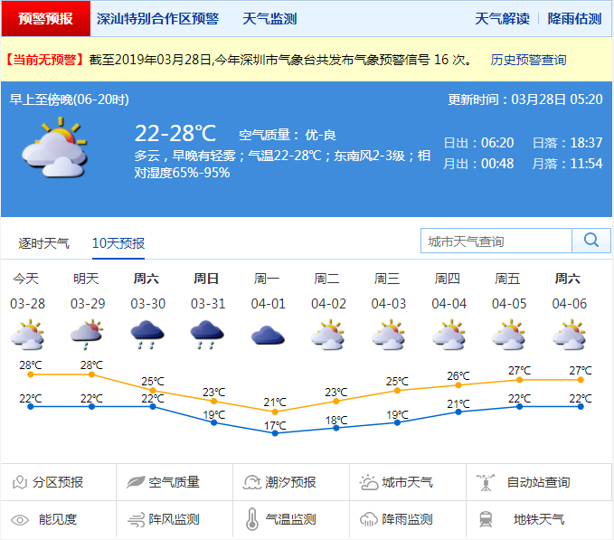 深圳新聞網(wǎng)2019年3月28日訊 深圳今日多云,早晚有輕霧或霧;20-27℃;南風2-3級;濕度60%-95%。預(yù)計29日多云轉(zhuǎn)陣雨;30-31日冷空氣影響,陰天有陣雨或雷陣雨,天氣轉(zhuǎn)涼;4月1日陰轉(zhuǎn)多云,偶有零星小雨;2日起氣溫逐日回升。