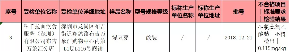 食用農產品也有1批次檢出不合格,不合格樣品為綠豆芽,不合格項目為4-氯苯氧乙酸鈉。