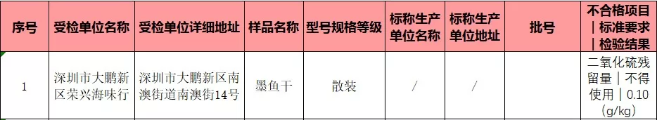 水產品有1批次檢出不合格,不合格樣品為墨魚干,不合格項目為二氧化硫殘留量。
