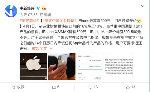 蘋果中國全系降價(jià):iPhone最高降500元,用戶可退差價(jià)。4月1日,蘋果中國調(diào)整了旗下產(chǎn)品的售價(jià)相關(guān)話題也沖上熱搜第一。