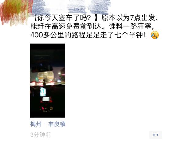 有坐大巴的朋友因為塞車時間遠(yuǎn)超預(yù)期,遇上手機快沒電,心急不已,只能斷斷續(xù)續(xù)地開了又關(guān)機,以便與接他的家人保持聯(lián)系又留住最后一點電量。而家人也在當(dāng)?shù)乜h城等了他四五個小時。