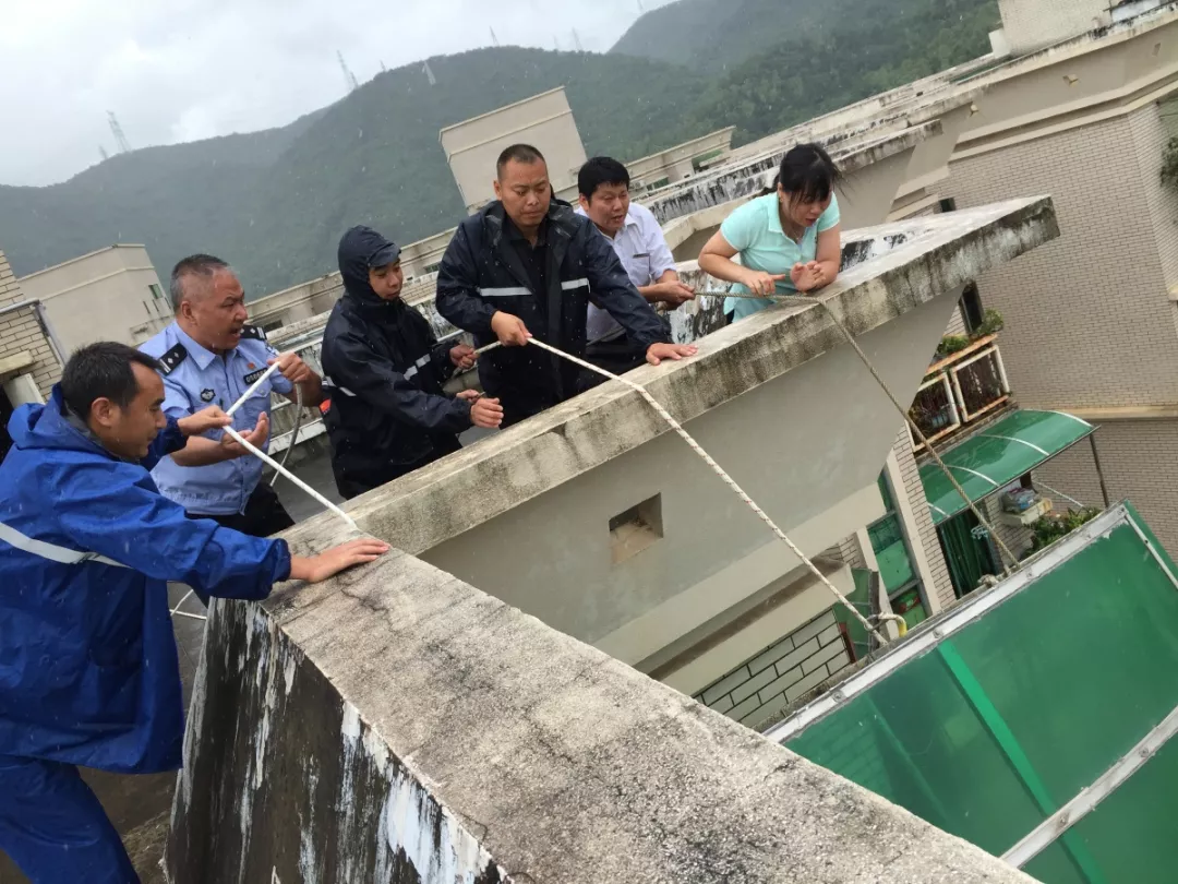 ▲2017年8月23日中午,在福田區(qū)梅林一村88棟,一家住戶的靠墻陽臺頂蓬固定支撐點已全部脫落,導致整個頂蓬向外傾斜,十分危險,福田公安分局梅林派出所民警聯(lián)合社區(qū)居民一起現(xiàn)場處置。